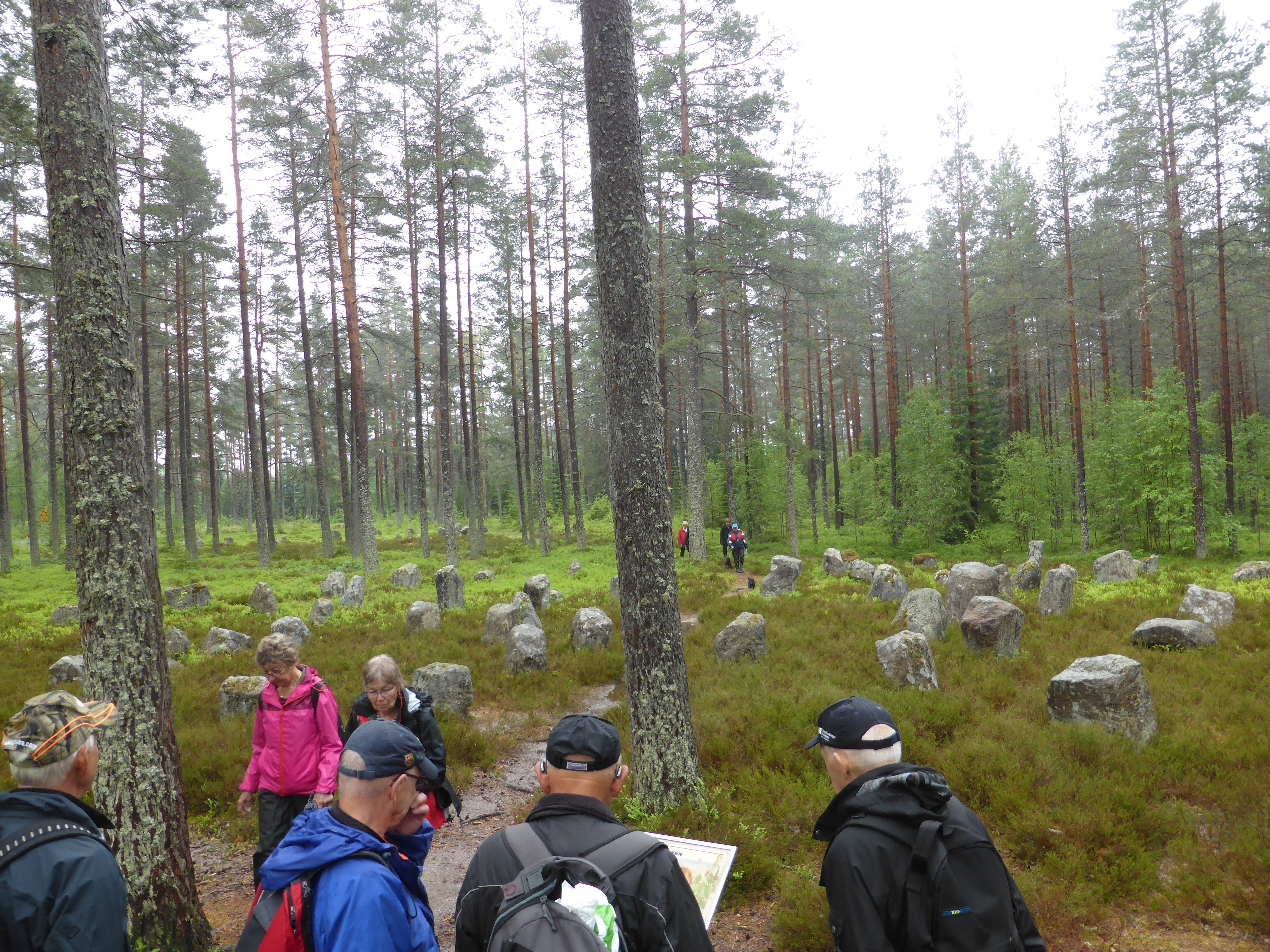 15 juni, 2016 by Roland Dagens vandring 2016.06.15 Det var 12 tappra som väl rustade trotsade vädrets makter och började en vandring vid Boeryds gravfält. Men regnet gav sig inte. Snarare tvärtom – Kaffet fick intagas på stående fot. Eskil lotsade os till den märkliga Trälastenen. Och där tittade faktiskt solen fram. Efter ca 5 km var vi tillbaka vid Boeryds fantastiska gravfält. Men kan fråga sig; Hur såg det ut här för 1500 år sedan?